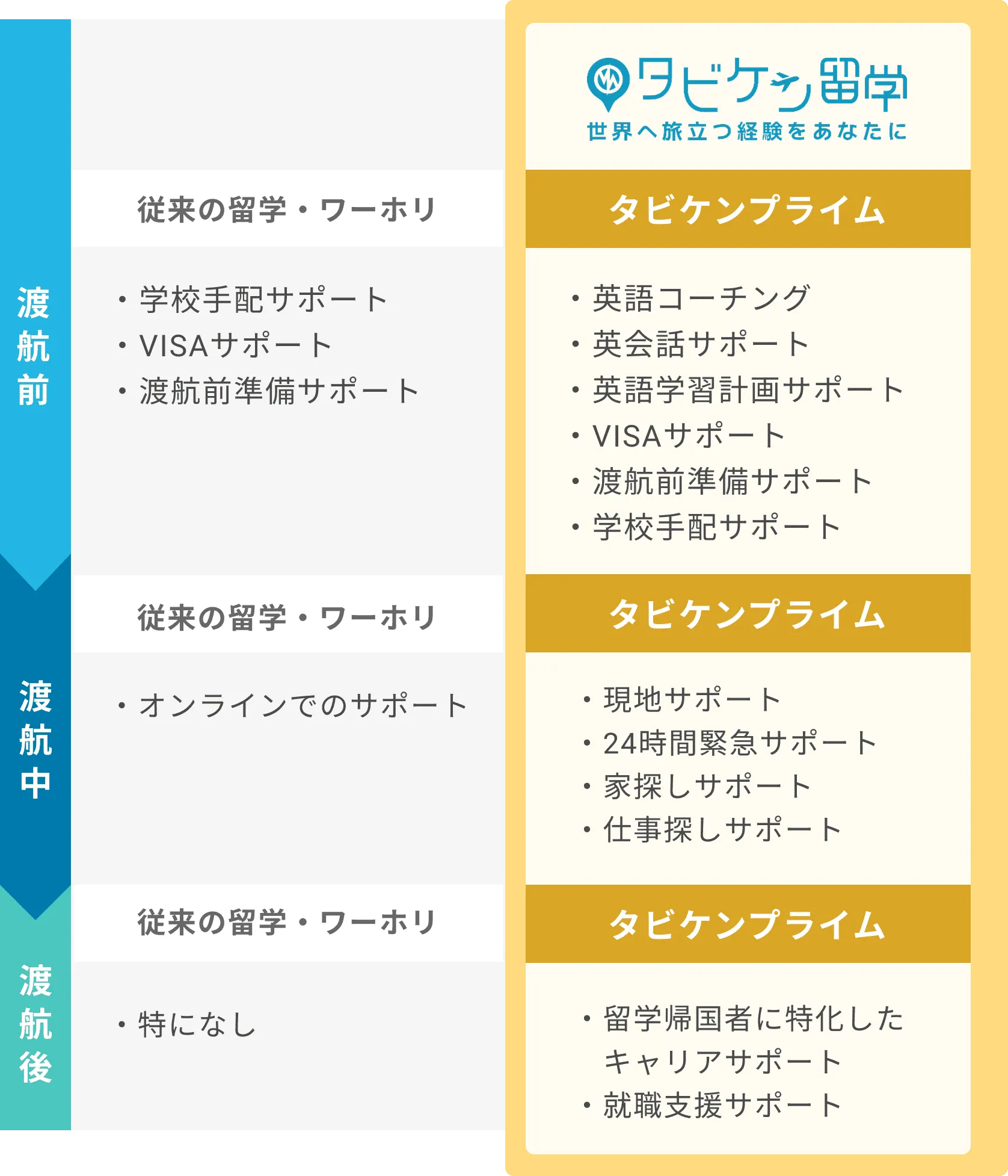 特徴 圧倒的サポート 渡航前〜渡航後までトータルプロデュース |