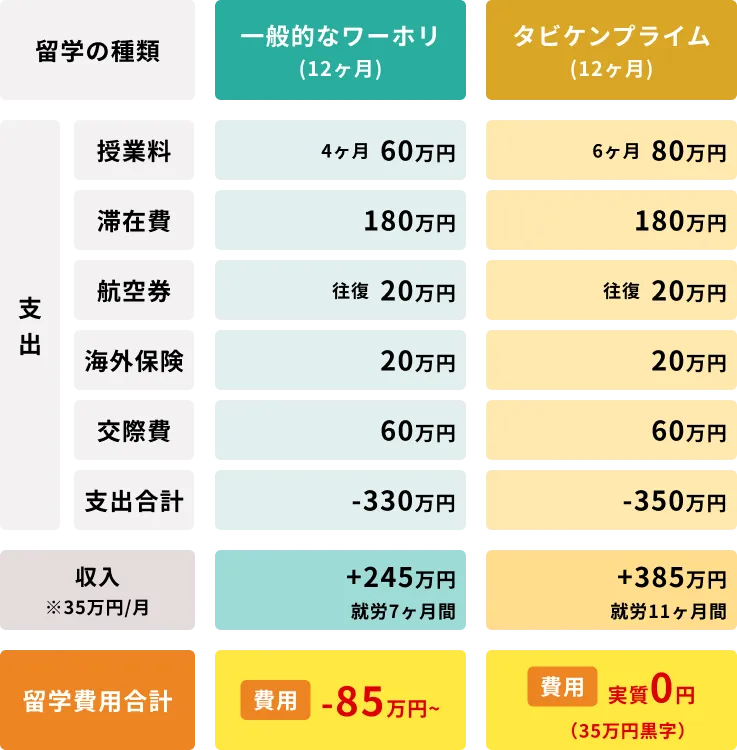 | 費用 渡航後すぐ稼げる ので収支プラス 最大30万円OFF キャンペーン中! |