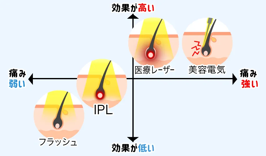 対してIPLは痛みが少なく負担も小さいことから、無理なく続けやすい方式として選ばれることが増えています。