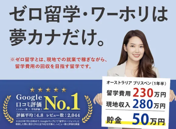 ※1 「ゼロワーホリ」とは、現地での就業で稼ぎながら、留学費用の回収を目指す留学です。実際に留学費用をすべて現地で回収できた事例も多数ございます。