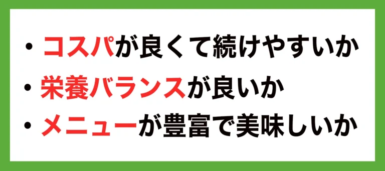 味・栄養バランス・値段・メニュー数を踏まえたコスパの良さを考慮して選んでいます。